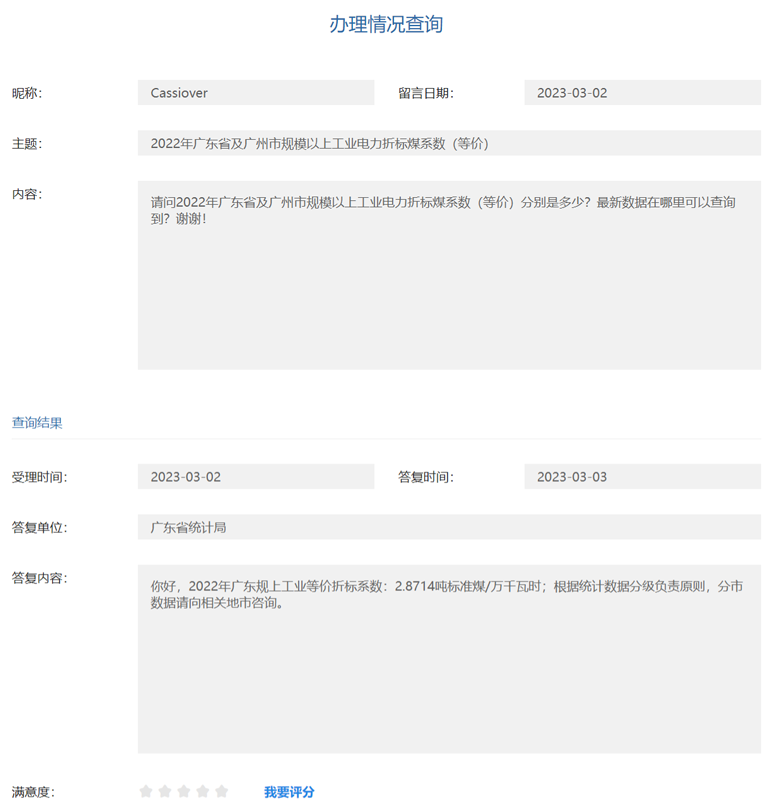 广东省统计局在 2023 年 3 月 3 日答复网友询问时,公布了 2022 年广东省规模以上工业电力折标等价值系数为 2.8714 吨标准煤/万千瓦时。(相关链接)