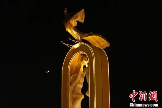 “金星伴月”与银川凤凰碑遥相呼应。图/视觉中国