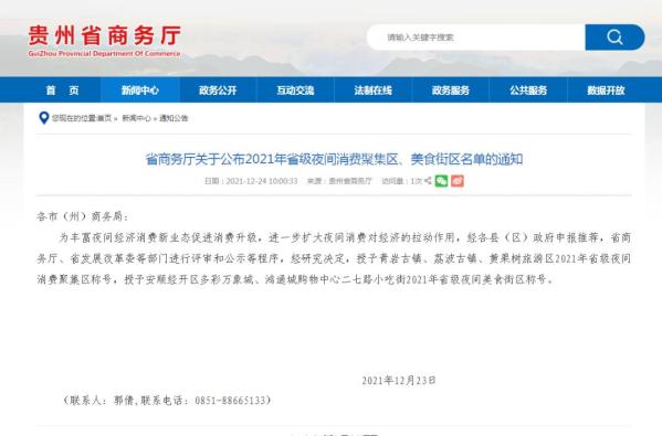 贵州省商务厅发布《关于公布2021年省级夜间消费聚集区、美食街区名单的通知》,授予青岩古镇、荔波古镇、黄果树旅游区2021年省级夜间消费聚集区称号,授予鸿通城购物中心二七路小吃街、安顺经开区多彩万象城2021年省级夜间美食街区称号。全文如下: