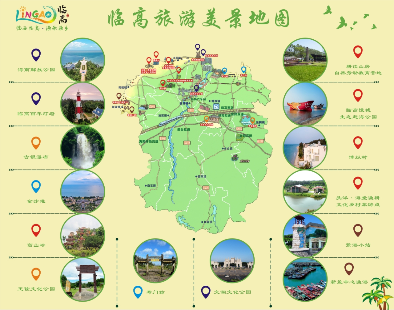 临高旅游美景地图以红色为底色,从海南解放公园出发,这里红色历史厚重,讲述了当年解放海南岛登陆战先烈的丰功伟绩,其中勇立革命潮头,传承红色精神的临高百年灯塔始建于1893年,被称为“世界一百座历史文物灯塔之一”。