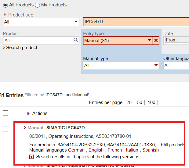 通常在查询结果中,第一个条目就是手册链接。如果查询结果中没有手册链接,请尝试把网站语言改成英文。
