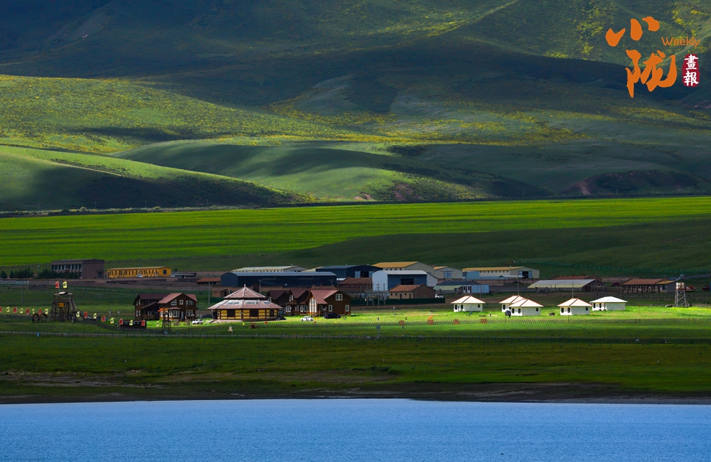 起伏的草地上,嫩绿的青草与明黄的野花混杂在一起,像极了一床素雅的织毯;点缀其间的牧民帐篷和现代民居、清澈的河流,则为这里增添了独特的韵味和人文气息。这片土地不仅承载了自然的恩赐,也记录着人们与大自然和谐共处的故事。