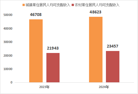全年全县城镇常住居民人均可支配收入48623元,比上年增长4.1%。农村常住居民人均可支配收入23457元,比上年增长6.9%。
