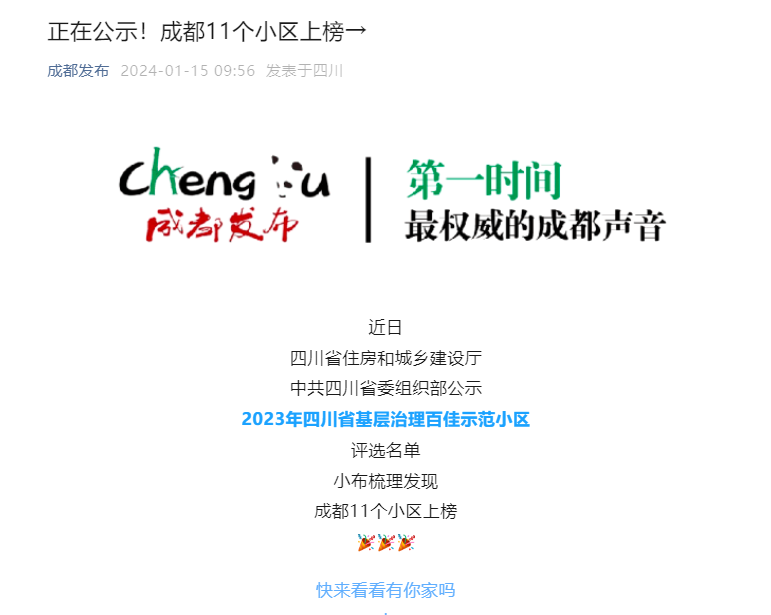 中国质量新闻网讯(顾爱龙)1月15日,官方微信公众号成都发布消息,四川省住房和城乡建设厅、中共四川省委组织部公示2023年四川省基层治理百佳示范小区评选名单,成都市11个小区上榜。