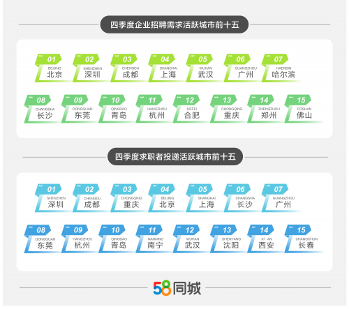 用工需求方面,2023年四季度招聘活跃城市前十五的分别为北京、深圳、成都、上海、武汉、广州、哈尔滨、长沙、东莞、青岛、杭州、合肥、重庆、郑州、佛山。今年以来,北京围绕推动先进制造业和现代服务业深度融合出台相关政策,大力开发就业岗位,全面加强就业服务,营商环境的优化、居民消费潜力的释放,带动相关招聘岗位持续增加。除了“北上广深”外,哈尔滨、长沙、青岛等热门旅游城市也跻身招聘活跃城市TOP10。在社交媒体上,哈尔滨凭借“冰雪大世界”“东北冻梨”等特色文化火爆出圈,吸引全国游客前来体验,企业招聘需求总量也随之飙升。