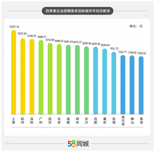 除政策导向外,具有竞争力的市场薪酬是企业锁定人才的“利器”。从整体城市招聘薪资来看,2023年四季度,热门招聘前十五的城市企业招聘平均月薪8388元。其中,上海平均招聘薪资最高,为10297元,广州“加薪抢人”,平均招聘薪资分别为9068元,环比2023年Q3增长1.9%。