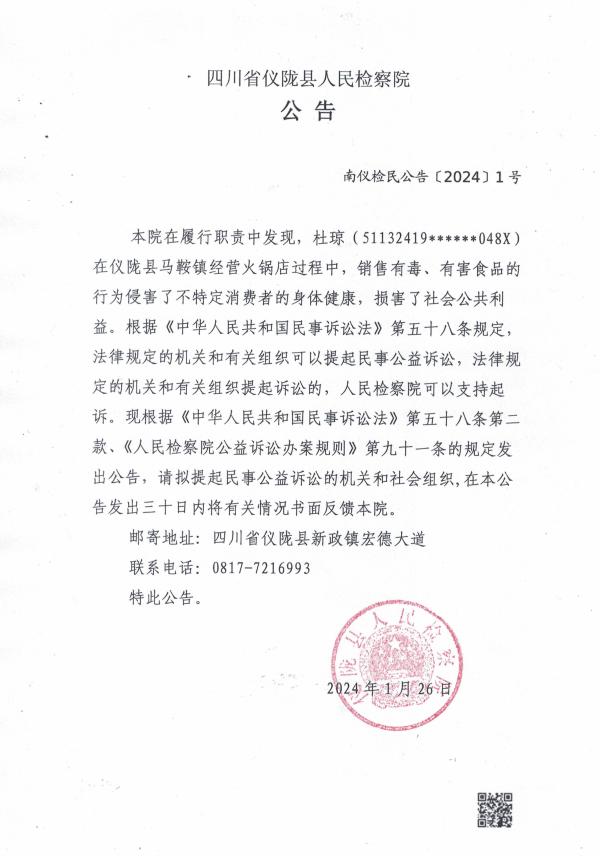 本院在履行职责中发现,杜琼(51132419******048X)在仪陇县马鞍镇经营火锅店过程中,销售有毒、有害食品的行为侵害了不特定消费者的身体健康,损害了社会公共利益。根据《中华人民共和国民事诉讼法》第五十八条规定,法律规定的机关和有关组织可以提起民事公益诉讼,法律规定的机关和有关组织提起诉讼的,人民检察院可以支持起诉。现根据《中华人民共和国民事诉讼法》第五十八条第二款、《人民检察院公益诉讼办案规则》第九十一条的规定发出公告,请拟提起民事公益诉讼的机关和社会组织,在本公告发出三十日内将有关情况书面反馈本院。