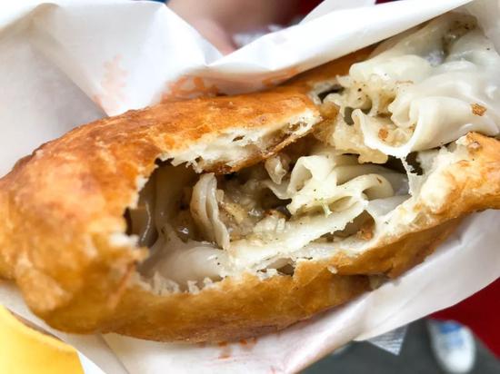 赵师傅名声大噪的是招牌油饼包烧麦,先把油饼炸到蓬松,圆乎乎的油饼内里空心,一戳热气就往外冒。