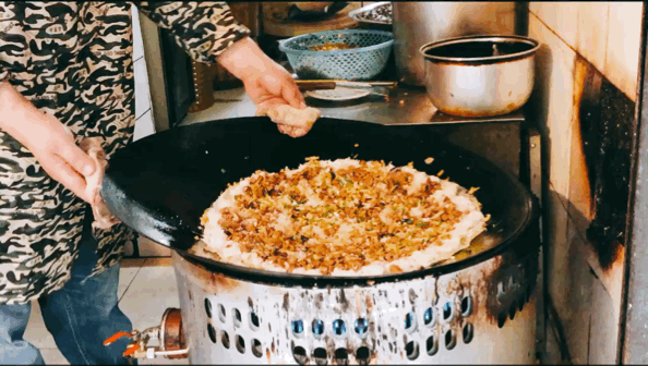 豆皮,是一种武汉特色早餐,先用调好的蛋液往滚烫的锅里绕个一圈,成一张蛋饼,之后往上铺满煮好的糯米饭,再往上叠加一层炒好的馅料。