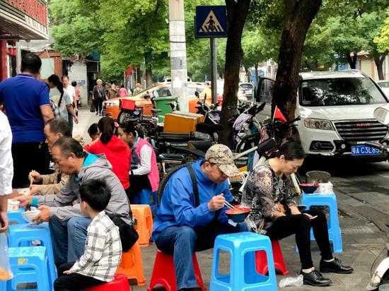 从早上5点半天蒙蒙亮开始,街边的早餐摊就支了起来,一碗热腾腾的面三分钟汆好,汆好之后立刻入碗,卤水、萝卜丁、酸豆角再加上一把葱花,最后淋上一勺芝麻酱。