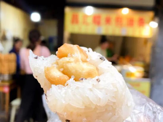 糯米包油条有咸有甜,咬下一口,就有小时候的味道,糯米粒粒分明,有嚼劲又不粘牙,糯米和里面馅料迸发出的丝丝甘甜,着实令人惊喜。