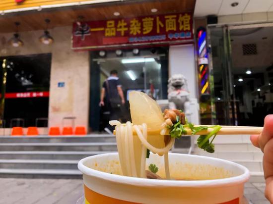 汤头不会过于咸味道醇厚,只有牛骨熬制出的香浓,白萝卜挂着汤汁看起来如同一块白玉,汤头鲜香,没有一丝牛杂的腥气,大口嗦粉,真是一件令人幸福的事情。