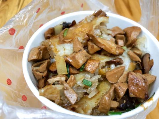 普通豆皮多为三鲜料,笋丁、五花肉、香菇丁和香干不断炒制,最后加上一勺卤水,滋味渗透进糯米饭里,是吃一口忘不了的神仙滋味了。