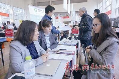 ▲在青岛大学举办的2018届毕业生供需见面双选会上,大学生求职者与用人单位洽谈。刘佳旎摄