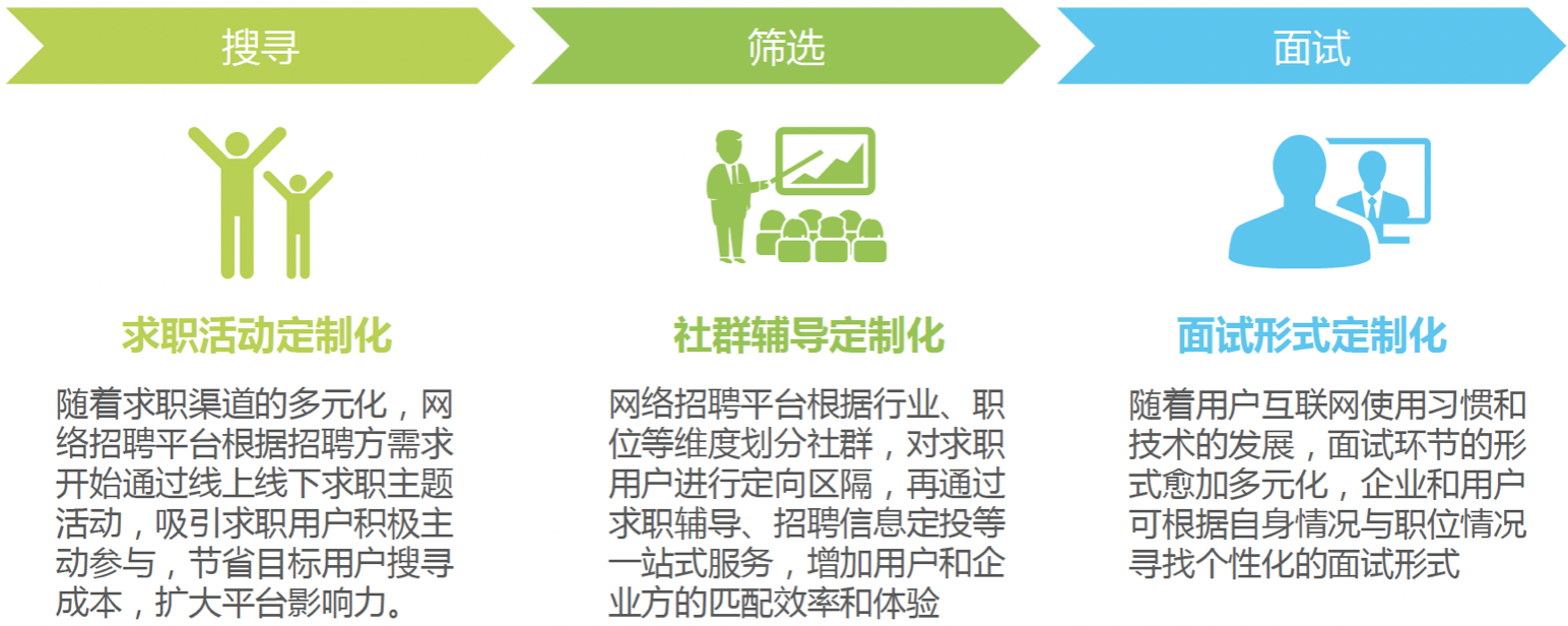 网络招聘平台服务定制化。随着用户求职渠道和经验日益丰富多元,各类小而美的网络招聘平台不断登场,未来定制化服务将成为覆盖网络招聘全流程的核心业务能力。