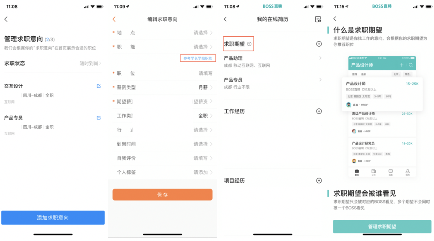 在求职意向的填写上,三者也略有不同。智联招聘填写页面简单清晰,未做详细描述(下图左一);前程无忧则因其涵盖校招的强大实力,添加一个特色功能为“参考学长学姐职能”(下图左二);而Boss直聘则通过对该项添加文本注释说明向用户阐述该项的重要性及作用(下图右一、右二)。