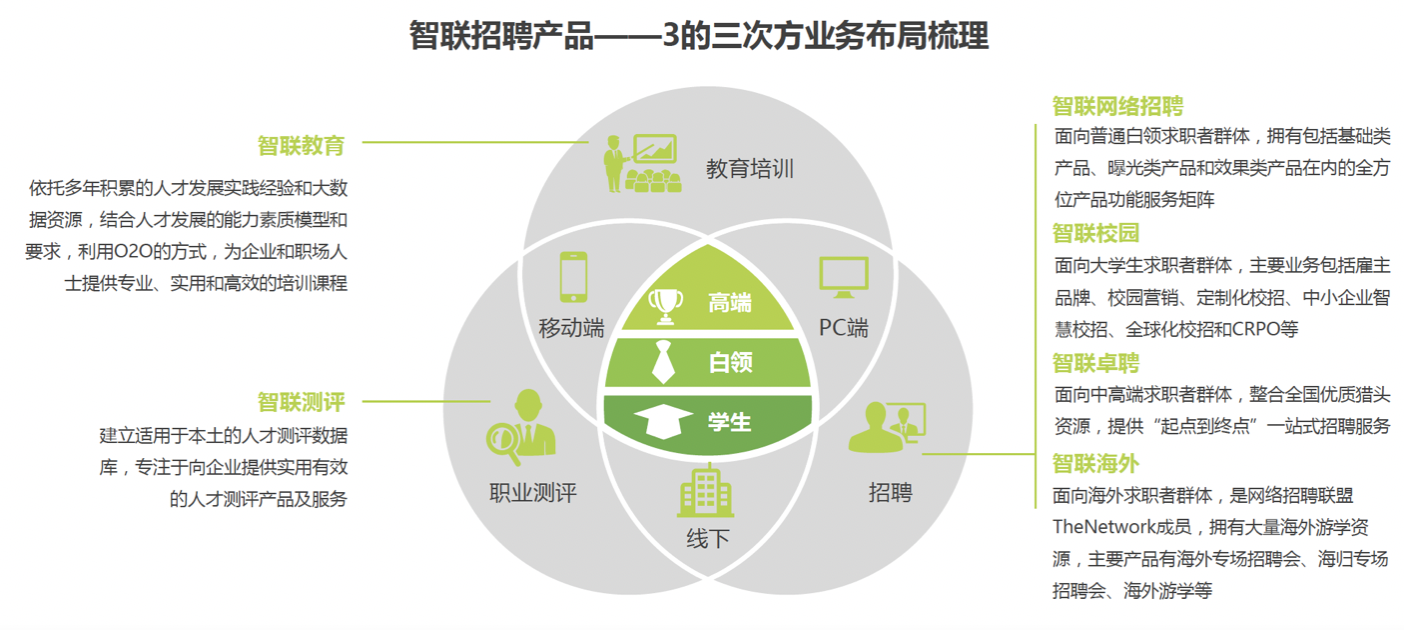 用户端覆盖人才测评、求职培训、求职论坛;平台端覆盖普通人才市场、校园招聘市场、高端人才市场;企业端覆盖招聘流程外包、 HR SaaS服务、雇主品牌建设与传播等。网络招聘平台未来主要以垂直招聘、 HR SaaS服务、职业培训并行发展。