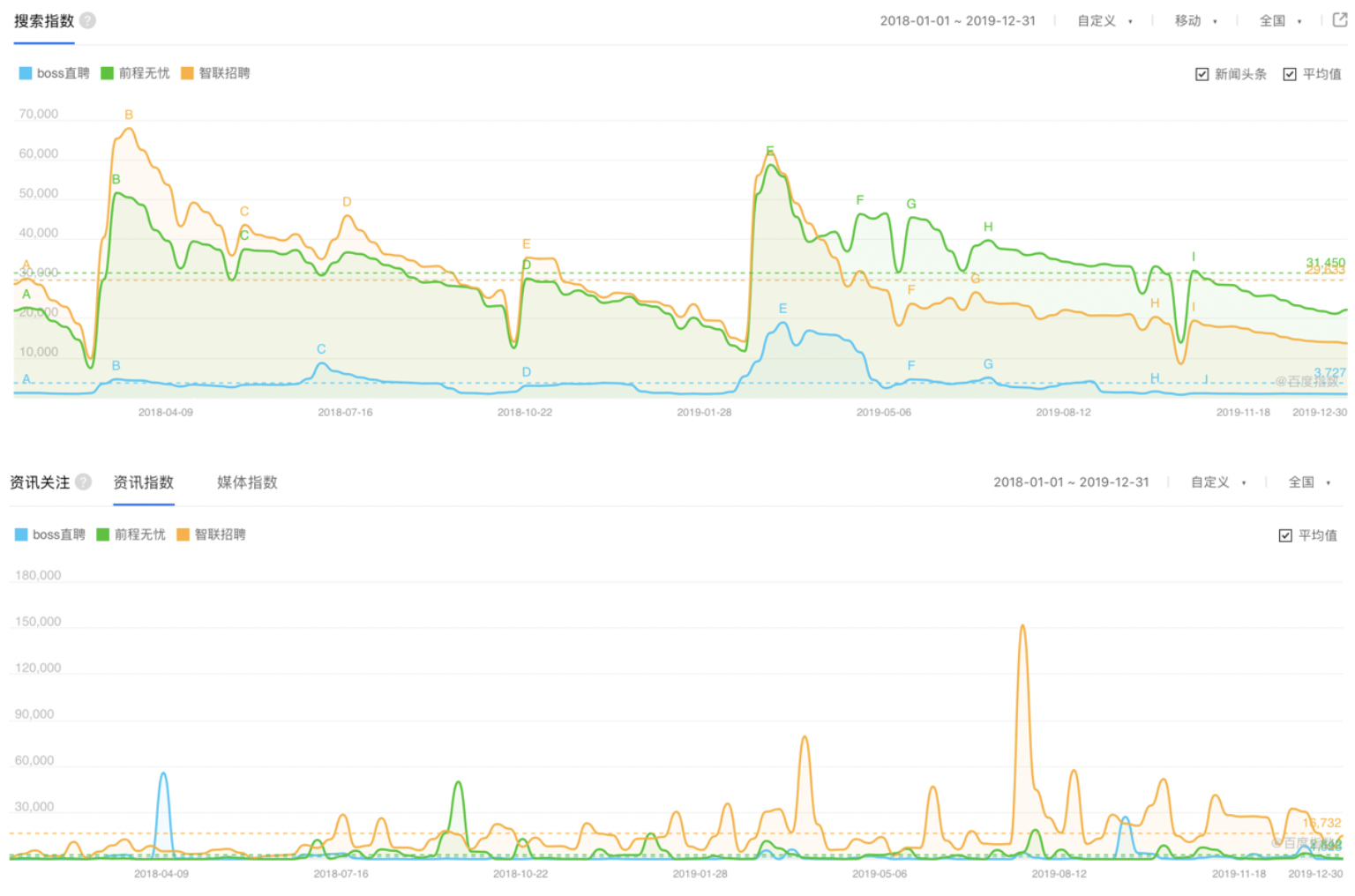 整体来看,PC端的搜索指数在2018年3月招聘旺季突破12000,随后便呈现略微下降趋势,而移动端的搜索指数则在2019年呈现多次井喷式上涨,数个时间点搜索指数突破20万。