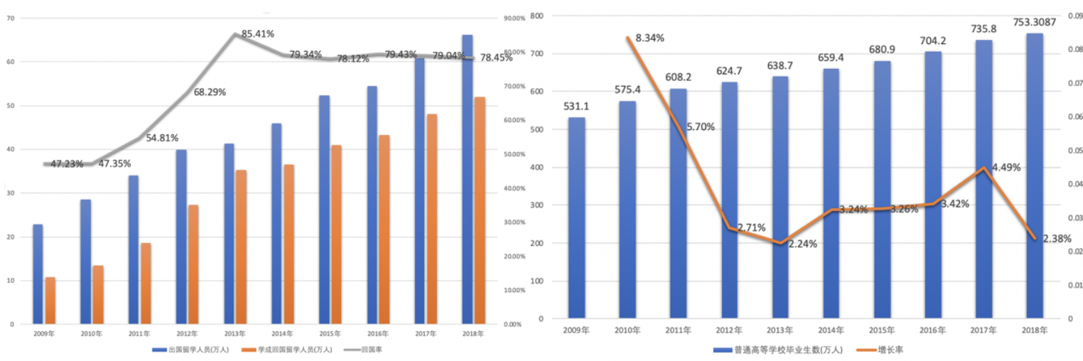 国内高校毕业生数量逐年增长,留学生毕业数日益攀升且回国率持续处于高位。