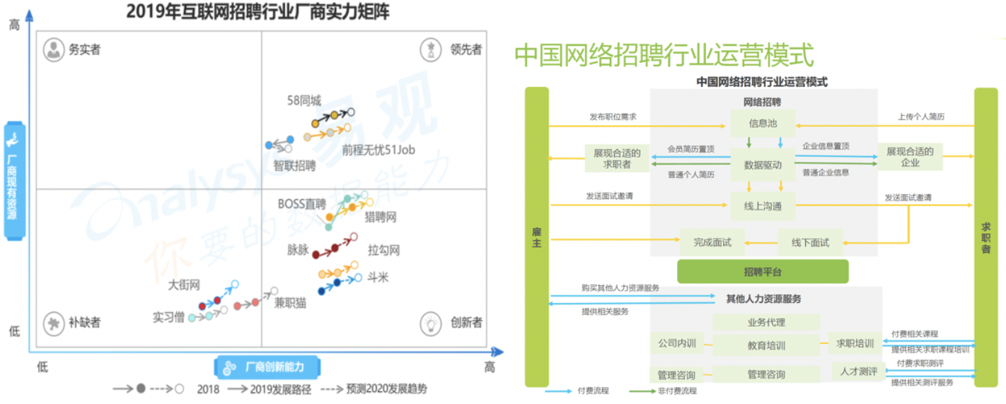 我国网络招聘行业运营模式,主要包括促进招聘方和求职者的信息匹配,以及提供其他相关人力资源服务。通过招聘方发布的职位需求以及求职者填写或上传的资料、简历的信息匹配,促进普通的线上沟通及线下面试,完成常规的求职招聘过程。