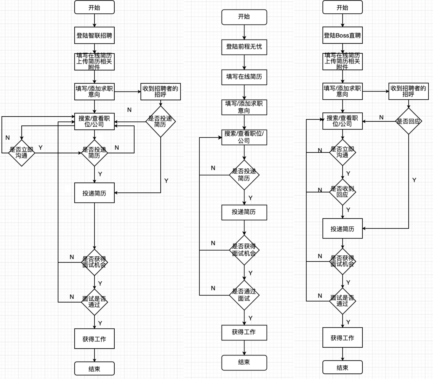 笔者仅针对智联招聘、前程无忧和Boss直聘基本求职招聘功能(即从登陆到获得面试邀请)流程绘制流程图。