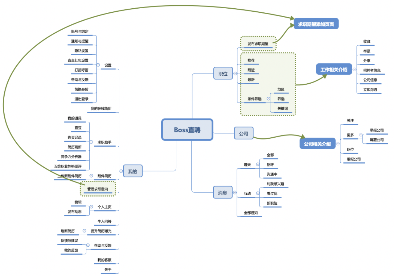 Boss直聘同智联招聘相似,首页职位页也主要为搜索、添加/管理求职意向和查看职位。职位详情页面最主要功能仅有立即沟通,双方交流后才可投递简历。公司也查看公司相关信息和正在招聘的职位,最后也去向职位详情页和沟通交流页面。
