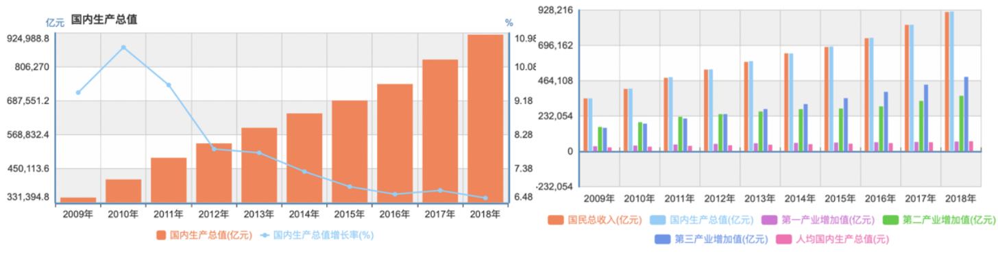 2009-2018年间,我国国内生产总值(GDP)日益攀升,期间由高速增长转为中高速增长,2015-2018年间GDP增长渐显稳定,国民经济运行平稳,国家实力逐年增强。