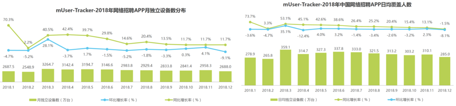 2018年,招聘APP日均独立设备数在3月达到最高点,突破350万台,与2017年同期相比增长53.1%,较2月增长35.1%。整体来看,全年的日均独立设备数量增速放缓,下半年日均独立设备数呈下降趋势。