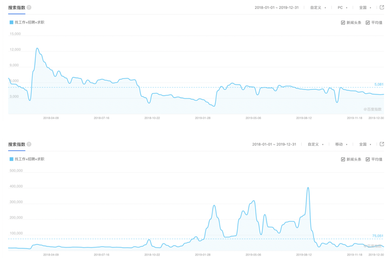 百度指数显示,2018-2019年间,移动端有关“找工作”、“求职”和“招聘”的词语的搜索指数远高于PC端(均值分别为75051和5081次)。