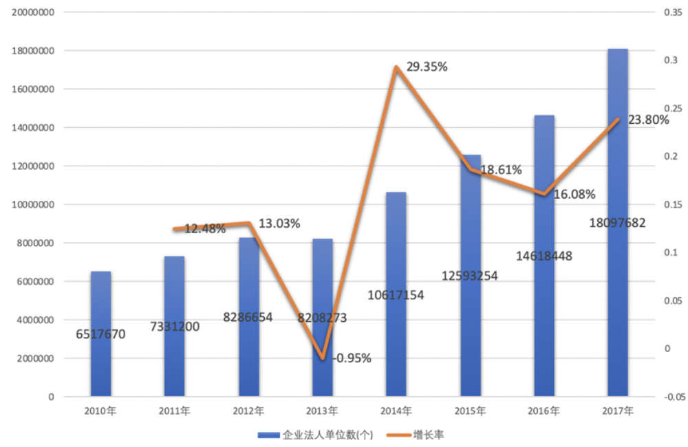 2010-2017年,我国企业法人数量逐年增加。随着国家降低市场准入门槛改革的推行,2013年后新增企业增量显著,截至2017年,我国企业法人单位数已超1809万,增长率高达23.80%。