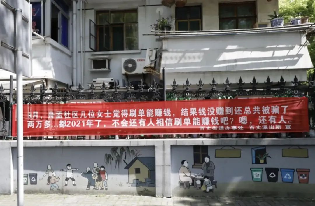 2021年3月,宁波舟孟社区的受骗者还被当作了宣传素材。央广网报道,该小区挂出横幅,“几位女士觉得刷单能赚钱,结果钱没赚到还总共被骗了两万多……2021年了,不会还有人相信刷单能赚钱吧?嗯,还有人。”