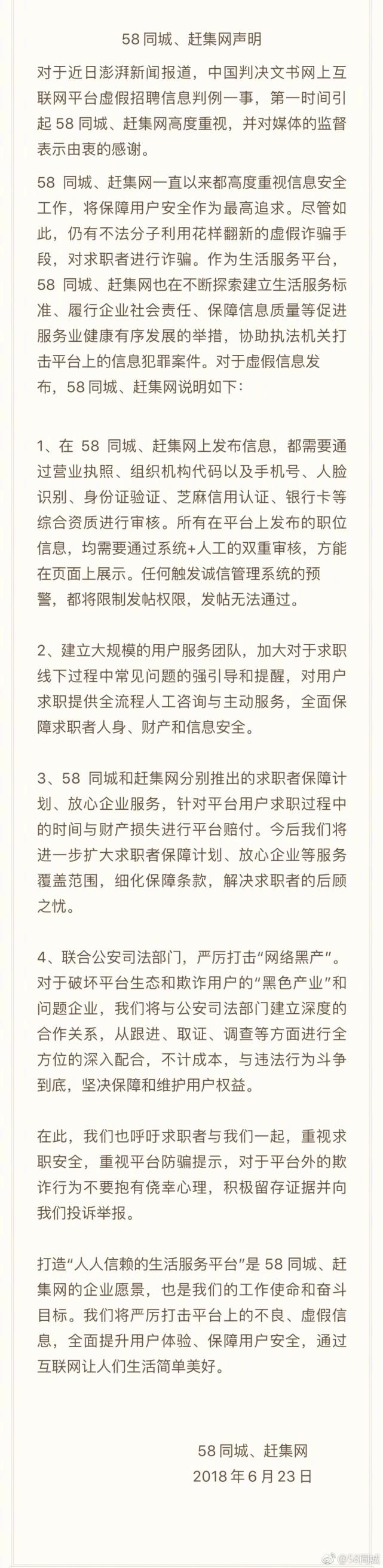 58同城6月24日通过其官方微博回应称,针对近日媒体报道,中国判决文书网上互联网平台虚假招聘信息判例一事,第一时间引起58同城、赶集网高度重视,并对媒体的监督表示由衷感谢。回应如下: