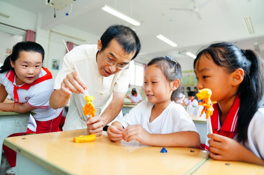 民间老艺人在教小朋友捏面塑