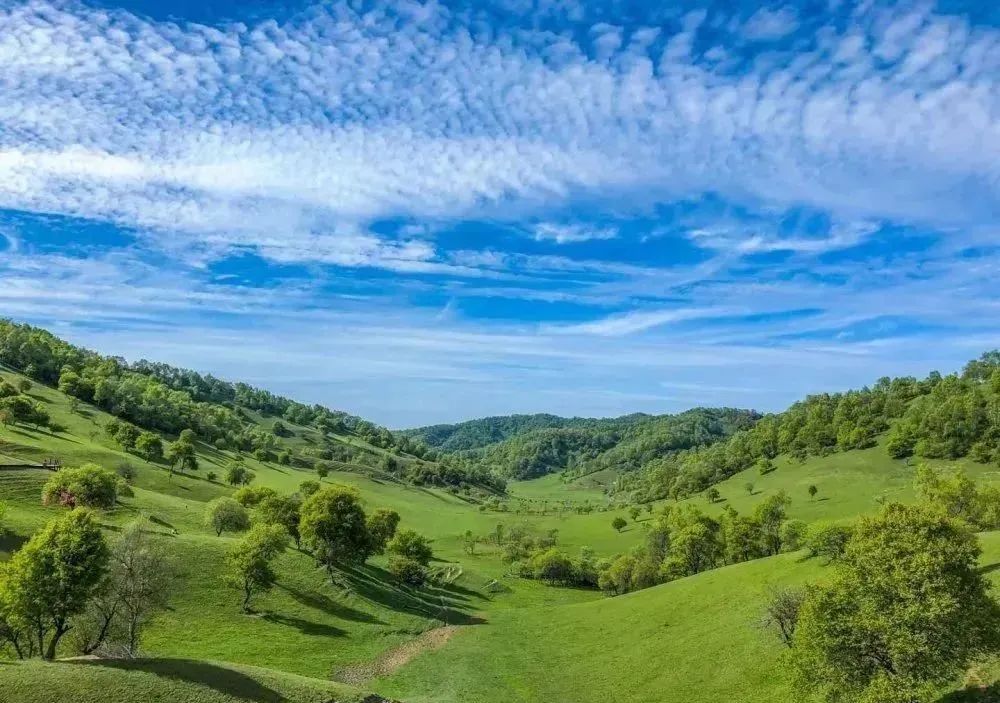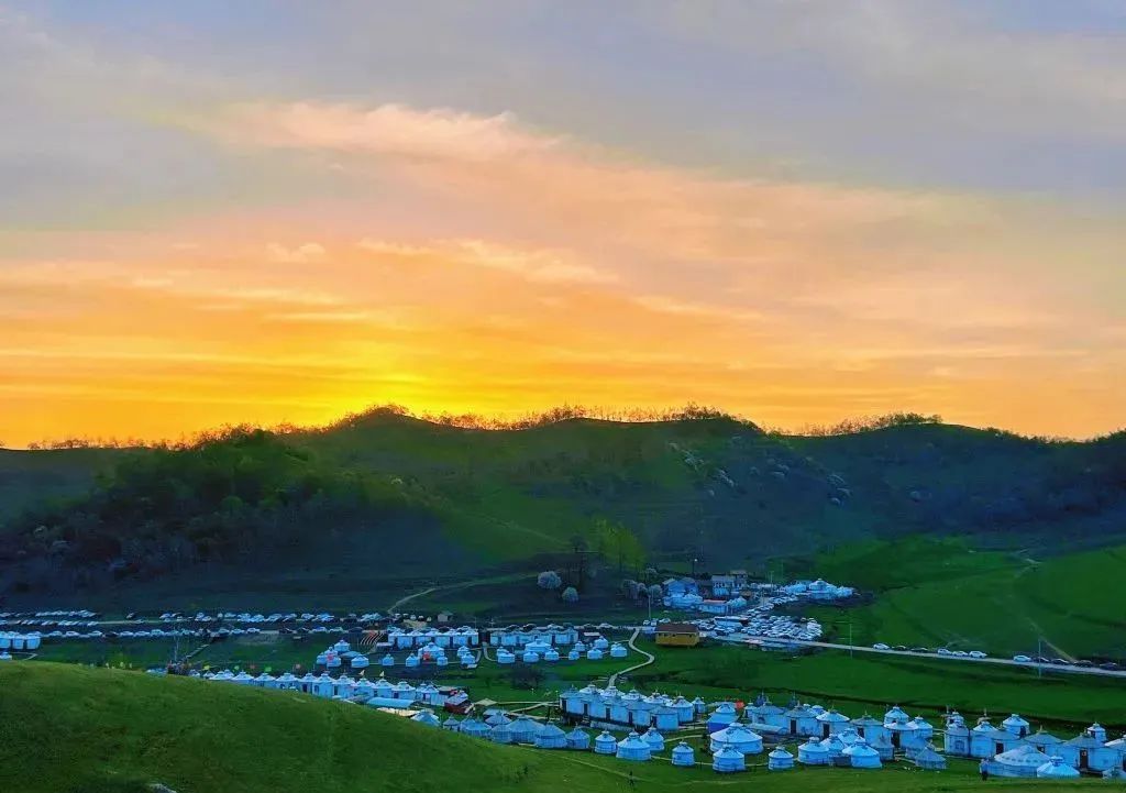 风吹绿柳、新蝉初鸣。初夏的关山草原一山绿草半山花,牛马成群,空气清新,如诗如画宛若人间仙境。嫩绿的草甸、湛蓝的天空、红色的建筑、金黄的夕阳、白色的薄雾、紫色的星空……