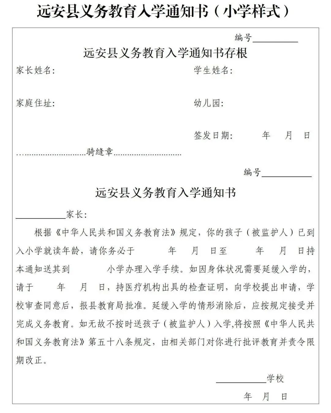 (三)乡镇小学招生。6月28日前,各乡镇(鸣凤城区以外乡镇)小学按照学校招生服务范围,对服务范围内适龄儿童进行摸底登记,造具年满6周岁应入学儿童名册。7月2日前,学校按名册发放《远安县义务教育入学通知书》(附件2)。