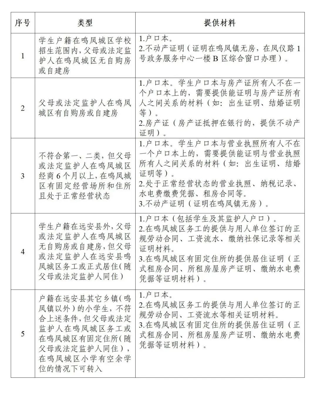 第五类:户籍在远安县其它乡镇(鸣凤镇以外)的小学生,不符合上述条件,但父母或法定监护人在鸣凤城区务工或在鸣凤城区有固定住所(随父母或法定监护人同住),在鸣凤城区小学有空余学位的情况下可转入。