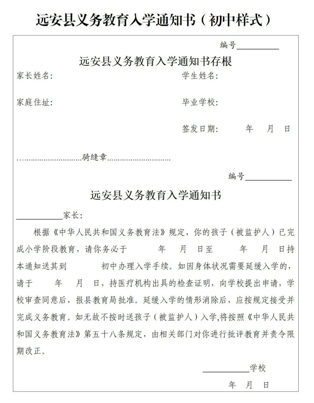 (二)远安县乡镇(鸣凤镇以外)适龄儿童和小学毕业生,符合鸣凤城区学校划片招生条件的,根据县教育局统一安排(具体时间另行通知),上交资料进行审核。教育局按照相应类别,根据户籍、房产证等条件和学校招生片区对应到相应学校,将新生名册发放到相应学校,由学校按新生名册发放《远安县义务教育入学通知书》。
