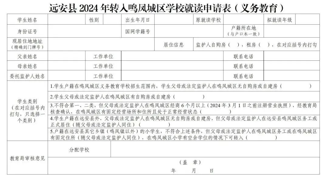 3.远安县2024年转入鸣凤城区学校就读申请表(义务教育)
