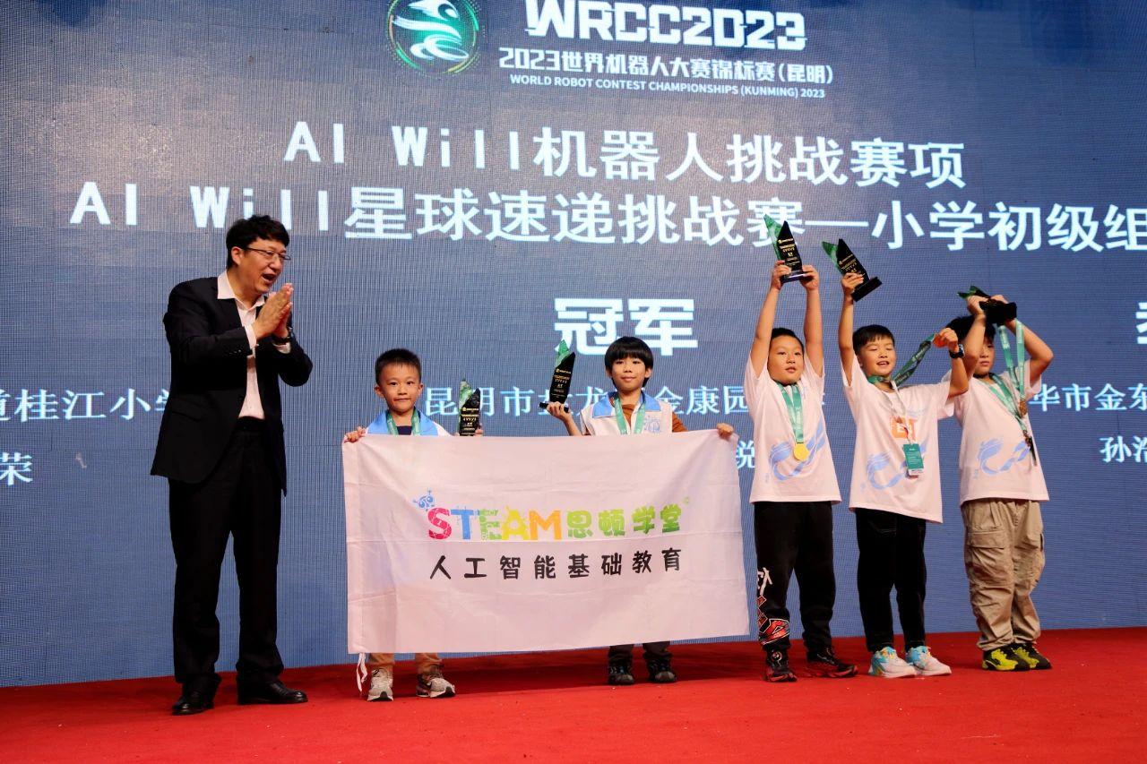 日前,在2023世界机器人大赛锦标赛(昆明)AI WILL 星球速递挑战赛——小学初级组赛项决赛中,来自昆明金康园小学的李鸿锐和队友以10分的优势夺取冠军奖杯。他们捧着冠军奖杯下台时,仍未从激烈的比赛中反应过来。