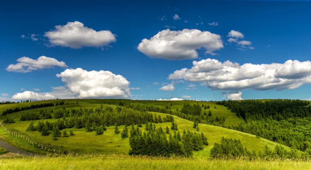 如诗如画的森林公园中,空旷辽阔的草原被的森林环抱,山峦叠翠的自然风光优美迷人,远离都市喧嚣,在这里尽情呼吸清新空气,感受内心的宁静和舒适。