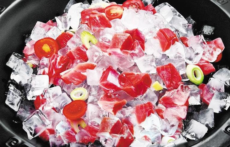 冰火不同炉,冰块遇热之后消融,铜锅上渐渐氤氲着缕缕白雾,萦绕在两厘米见方的粉红色肉块上,如梦如幻……