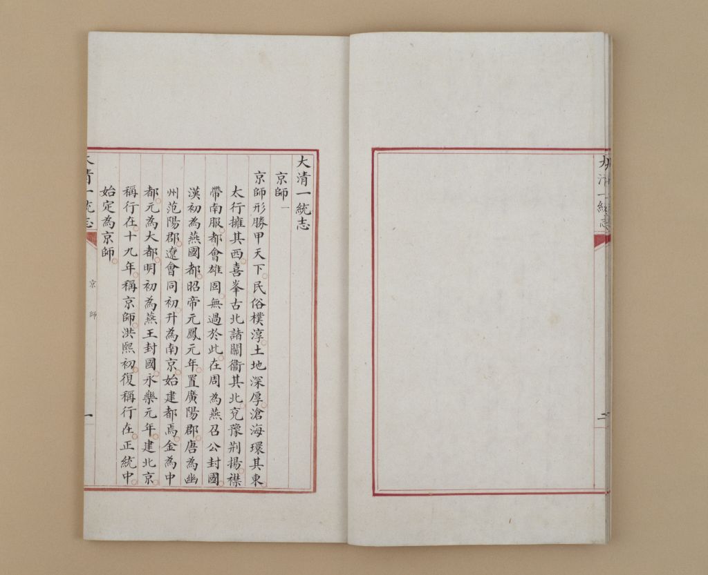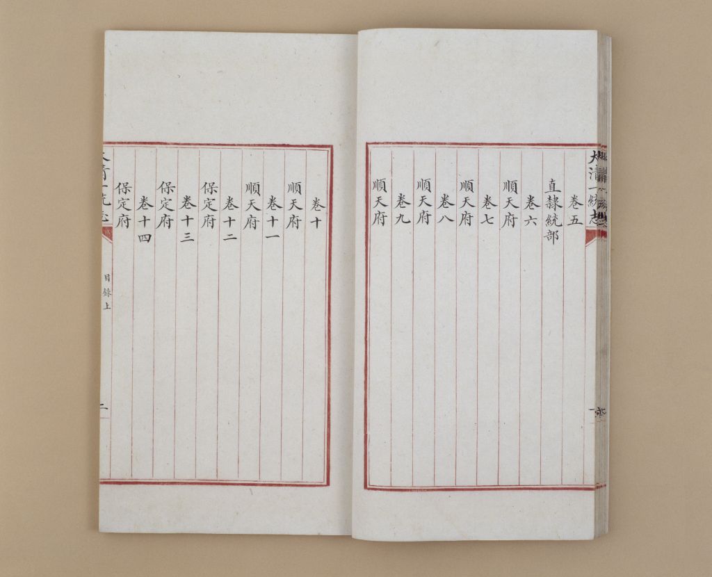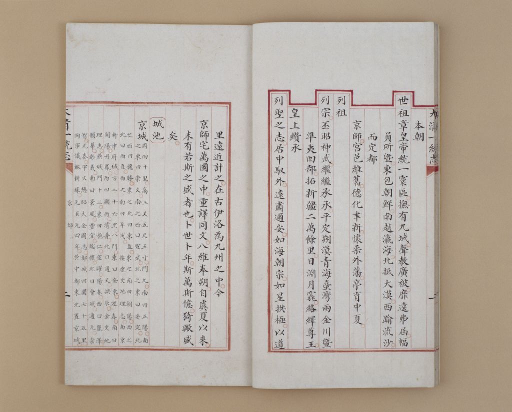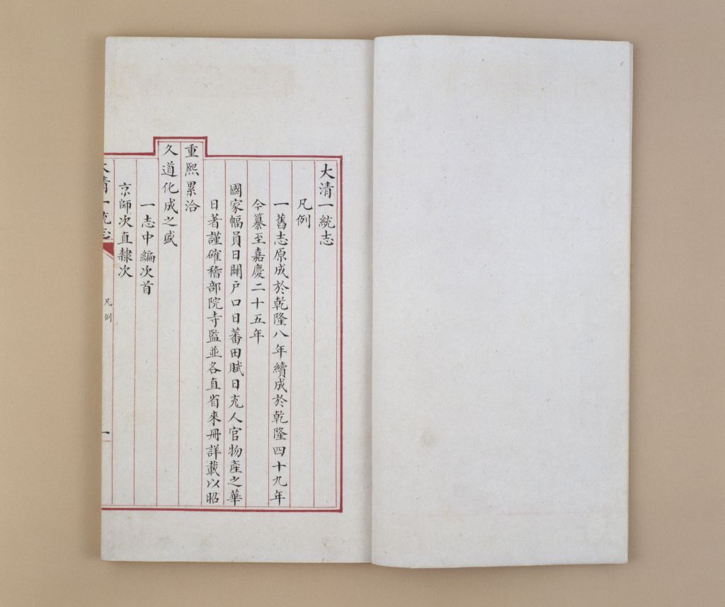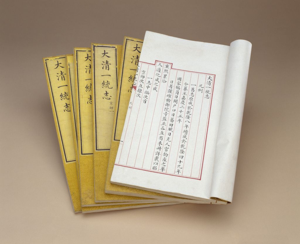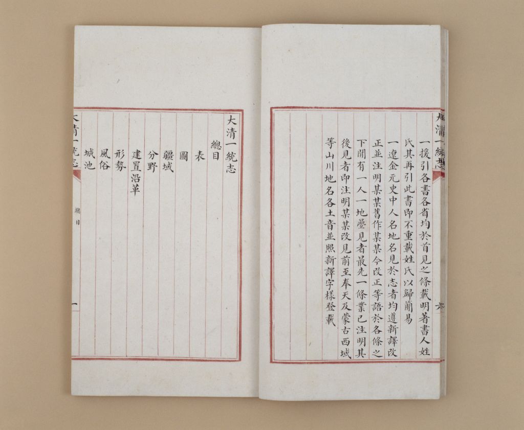 《大清一统志》(嘉庆朝本),560卷,清潘锡恩等撰,清道光二十二年(1842年)内府进呈抄本。版框22.5cm×14.5cm。半页10行,行19字,朱格双栏,白口,单鱼尾。545册80函。