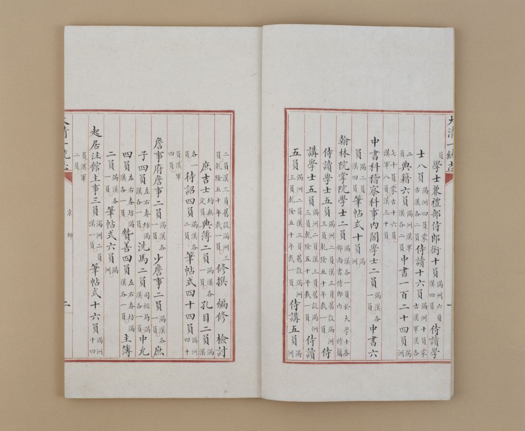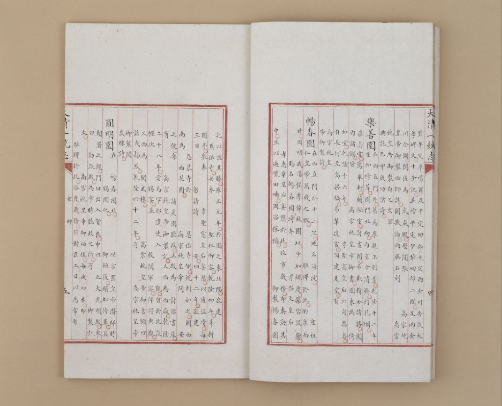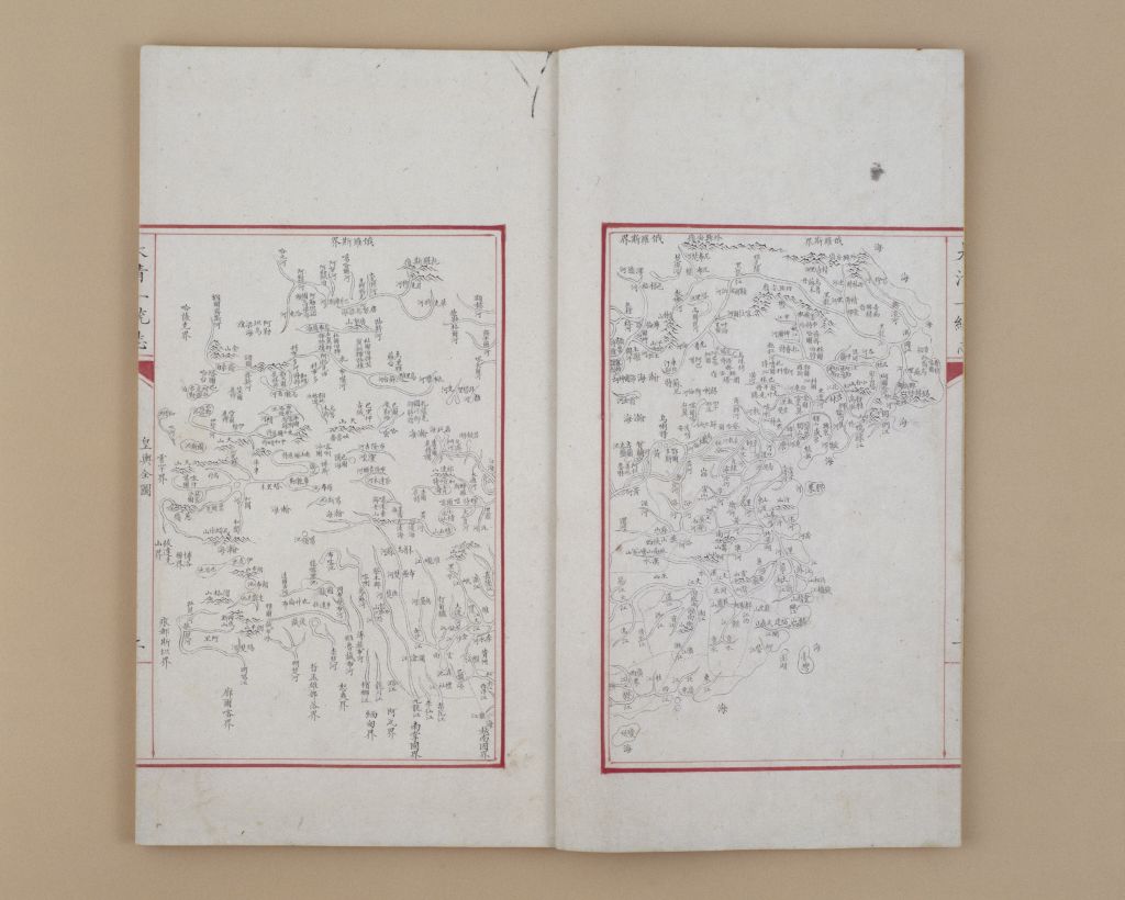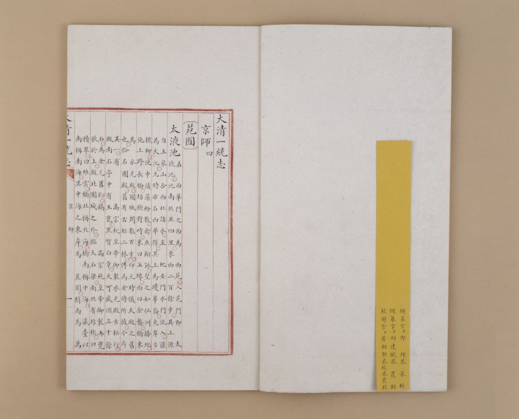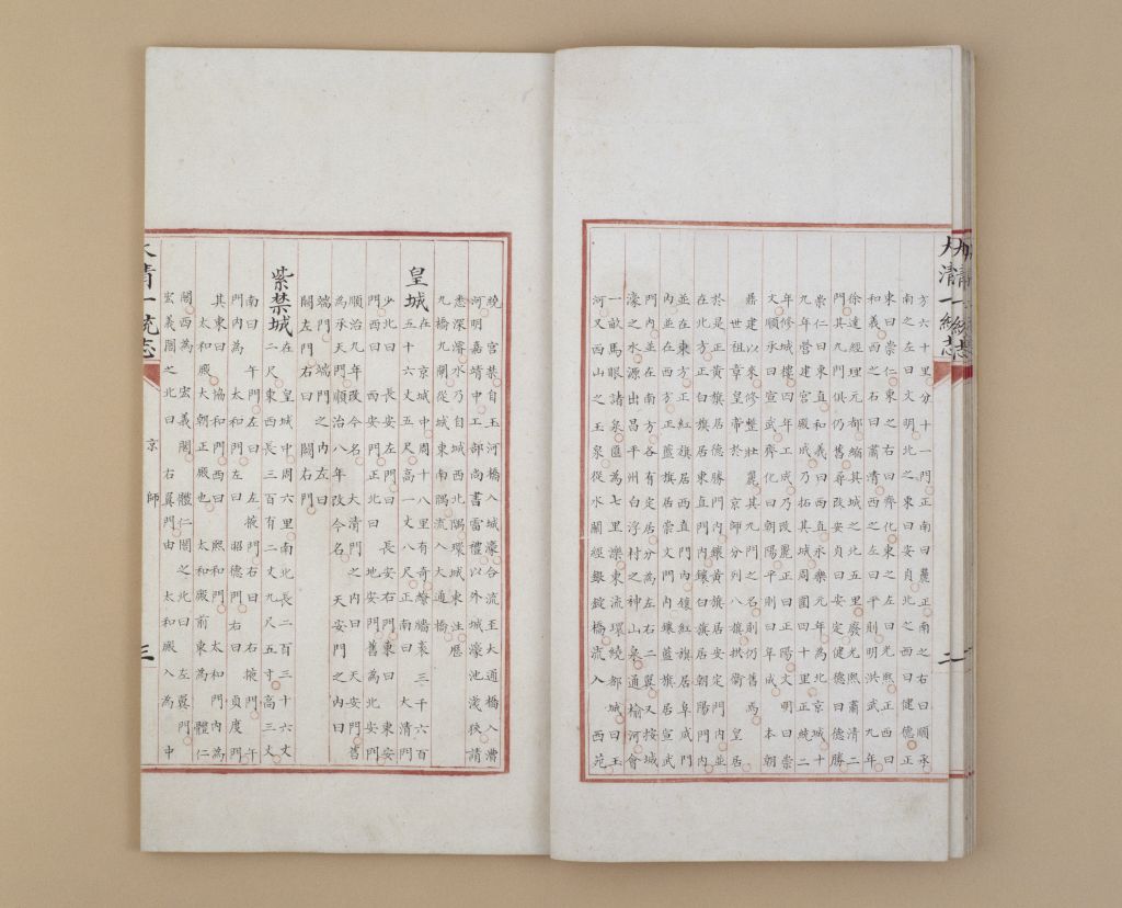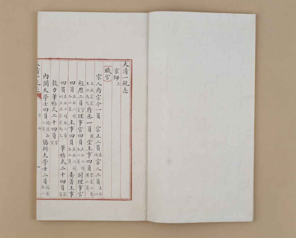 《大清一统志》(嘉庆朝本),560卷,清潘锡恩等撰,清道光二十二年(1842年)内府进呈抄本。版框22.5cm×14.5cm。半页10行,行19字,朱格双栏,白口,单鱼尾。545册80函。