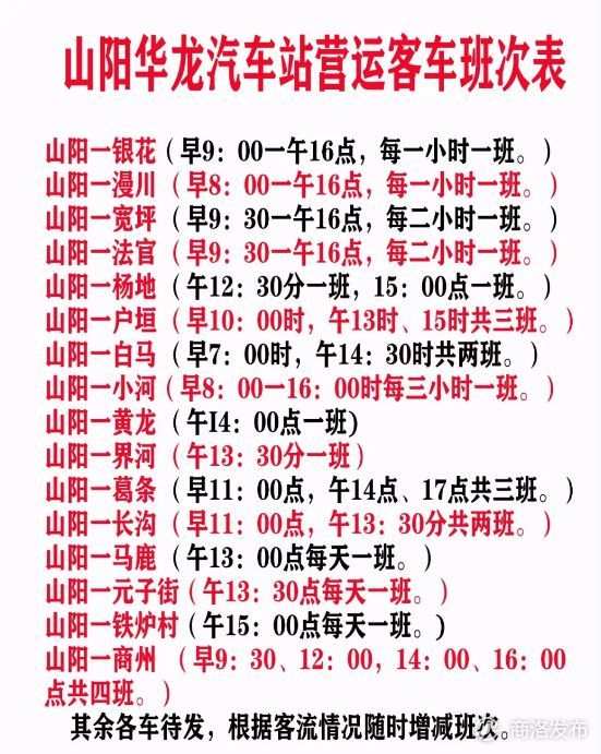 明天(3月3日)起,山阳县城至银花、漫川、宽坪、法官、杨地、户垣、白马、小河、黄龙、界河、葛条、长沟、马鹿、元子街、铁炉村等镇村的16条客运班线已恢复运营。