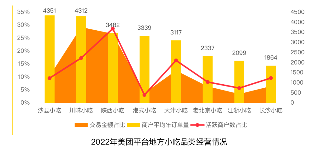 2022年在美团平台上各地方小吃品类中,沙县小吃活跃商户数占比为9.6%,占地方小吃总交易额的10.4%,店均年订单量超过4000单,超过其他地方小吃品类位列第一,在各主要小吃品类中交易金额排第四位。