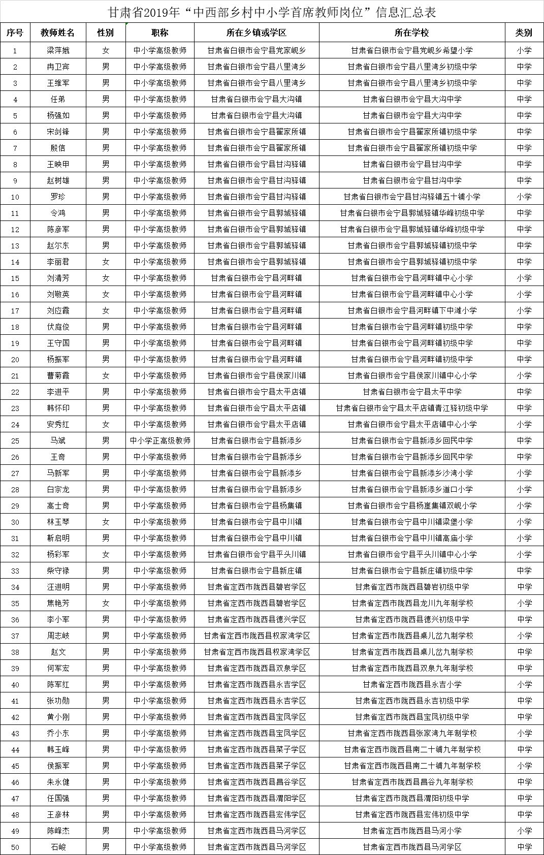 甘肃省2019年“中西部乡村中小学首席教师岗位”信息汇总表