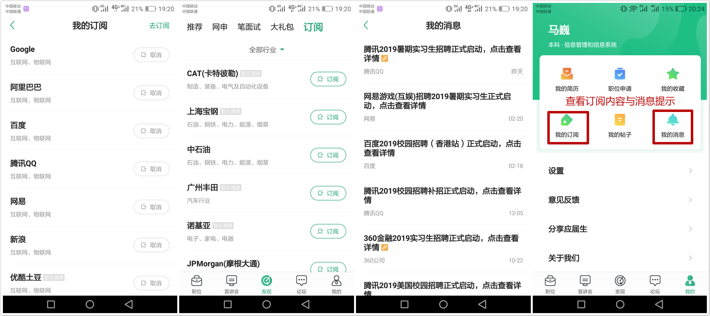 在“发现”tag页面中使用订阅功能,订阅想要求职的企业,该企业有消息时会通知用户;