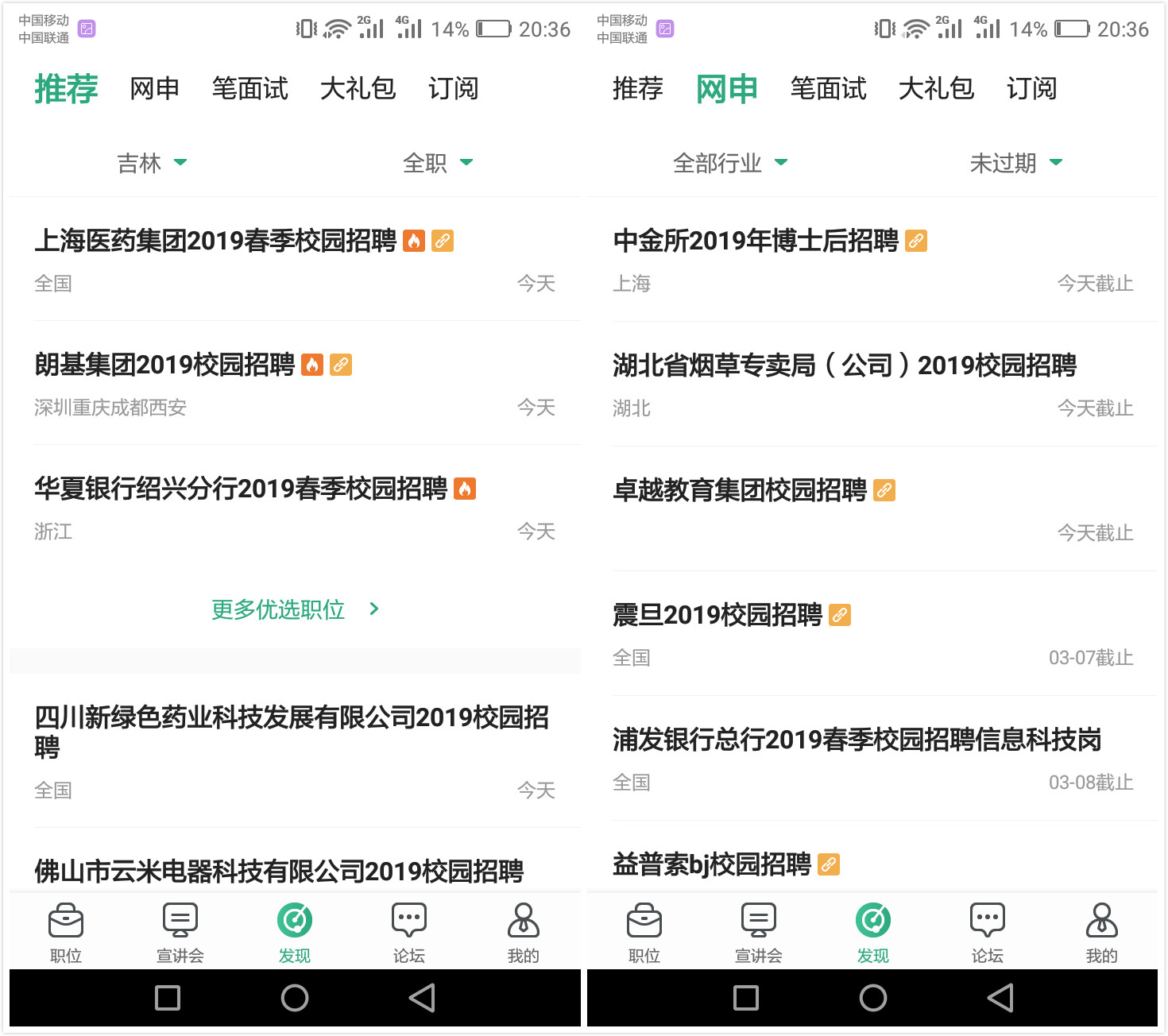 使用“发现”tag页面中的“推荐”和“网申”寻找职位;