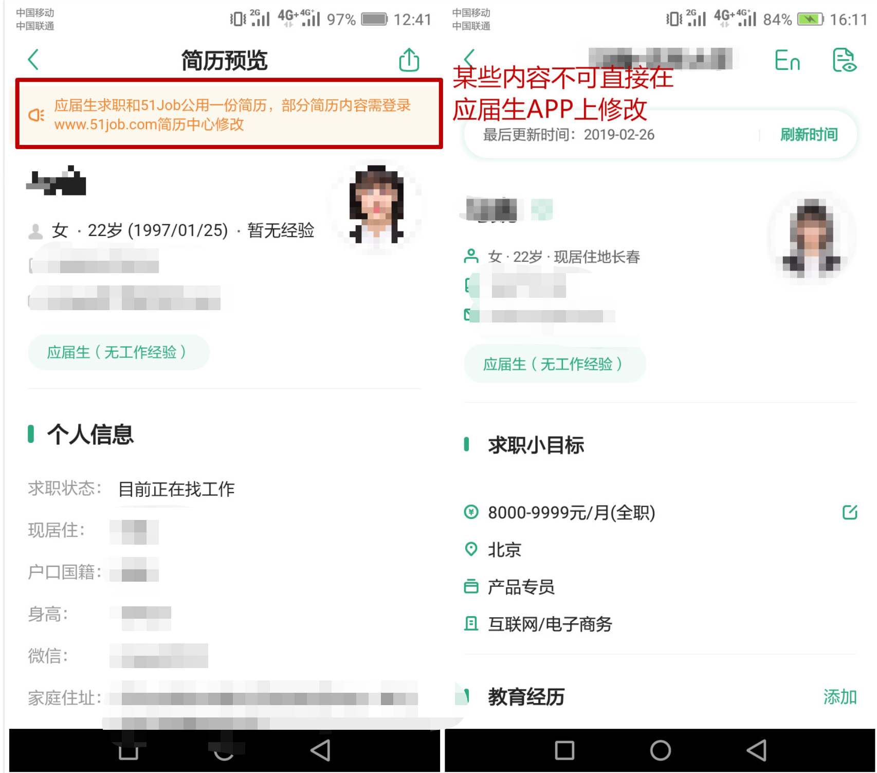 从交互上看:应届生求职被前程无忧51job收购后实现了一键登录功能,可以使用前程无忧51job账号登录应届生求职,在前程无忧51job上编辑的简历可同步到应届生求职,但应届生求职APP上只有一封简历,虽可以编辑但不可添加;