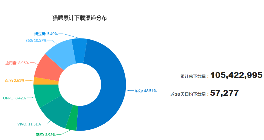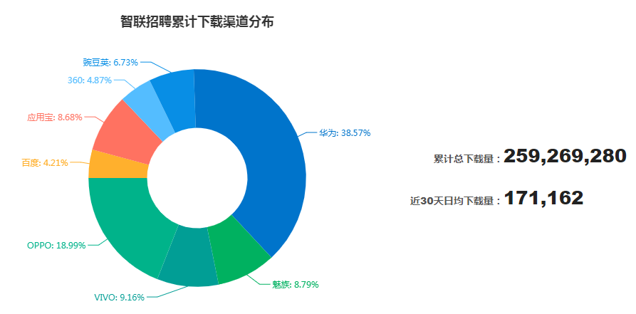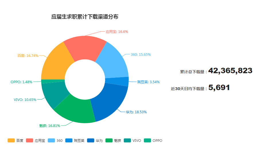 应届生求职APP累计下载总量42,365,823,近30天日均下载量5,691;其他主流网络招聘类APP下载量如下: